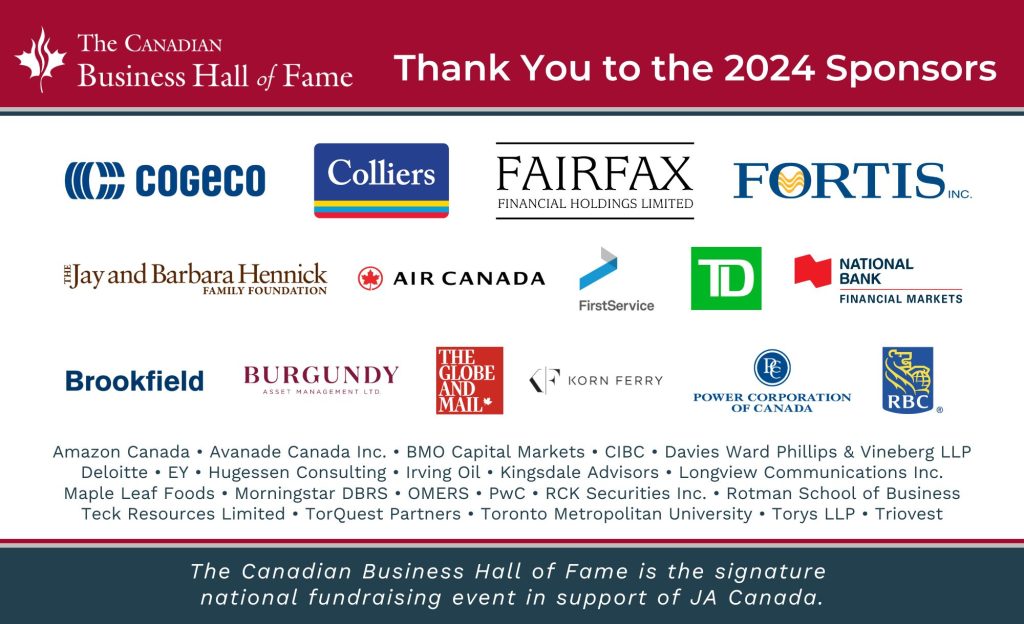 ON, April 29, 2024 – The Canadian Business Hall of Fame (CBHF) is pleased to announce the lead sponsors of the May 23rd Induction Ceremony and Celebration event.